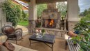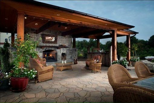 Роскошное патио с камином и под навесом