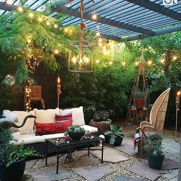 Романтический внутренний дворик с декоративной беседкой и подвесными светильниками