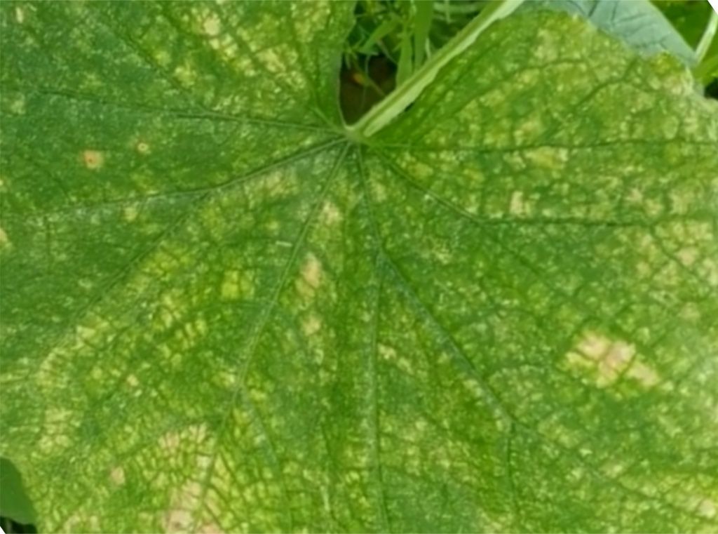 Рис. 2. Первоначальное поражение двухпятнистым паутинным клещом листьев огурца.