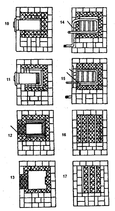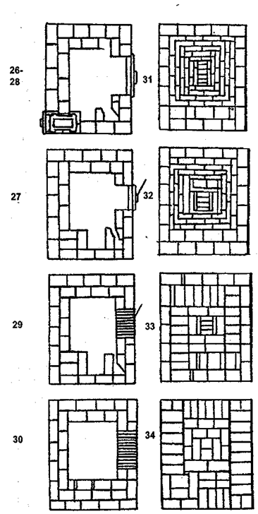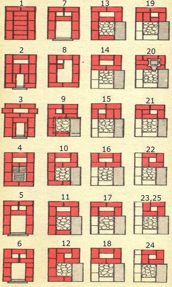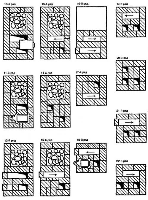 21 ряд аналогичен 12, но там имеются дымоходные каналы. Следующие два ряда происходит сужение топливных шахт, а в 24 шахта, где установлена емкость для камней перекрывается совершенно.