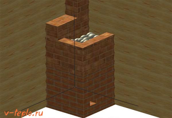 В 10-м дверцы поверху закрываются кирпичами, для чего они подпиливаются при необходимости в зависимости от формы. После завершения 11-го ряда над одной шахтой укладывается платформа плиты, а на другой шамотный кирпич укладывают только по коротким сторонам топки. После установки емкости для камней тут будут дымоходные каналы.