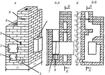 Следующие два без изменений, и только в 18-м добавляется дымоходная дверка, а в 19-м устанавливаются перемычки с другой стороны печи, которые послужат основанием для ее окончательного перекрытия и формирования свода печи.