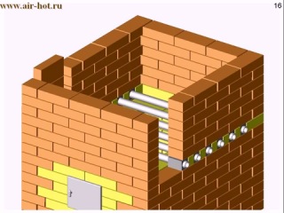 В 12-м ряду устанавливают металлический короб для камней, закладывают один из каналов дымохода. Следующие два ряда без изменений, и лишь в 15-м монтируют дверцу для чистки сажи. Далее в 16-м добавляются две металлические перемычки над основной шахтой.