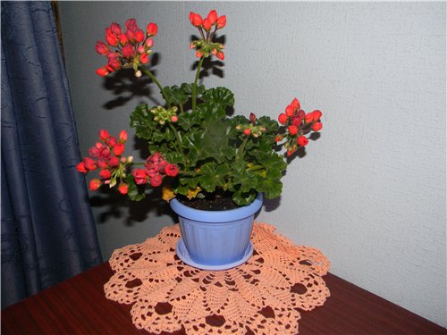 Является популярным представителем сортовой герани. Бутончики алые, полумахровые.