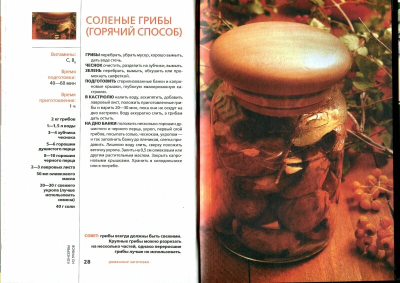 Вымачивание. Соленые грибы или грибы, имеющие горький вкус, вымачивают для улучшения их вкусовых качеств, сухие грибы — для восстановления в них влажности. Промытые грибы кладут в холодную воду и вымачивают до получения нужных результатов обычно в течение 2—6 часов. При вымачивании горьких или соленых грибов воду меняют через каждый час, чтобы нежелательные вещества быстрее растворились. Воду, в которой вымачивались сухие грибы, используют в пищу вместе с растворившимися в ней веществами. После длительного вымачивания, особенно если грибы вымачивают непосредственно после их тепловой обработки, в воде растворяется также много ценных питательных веществ.