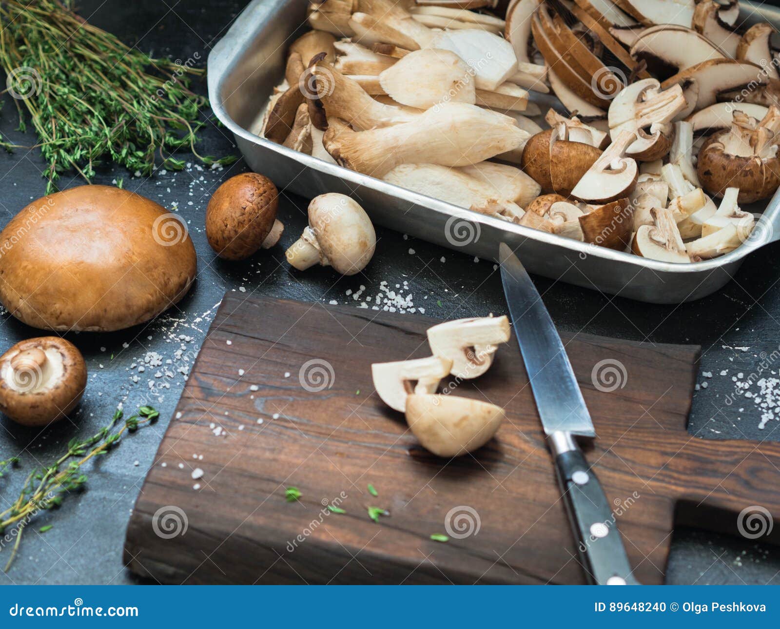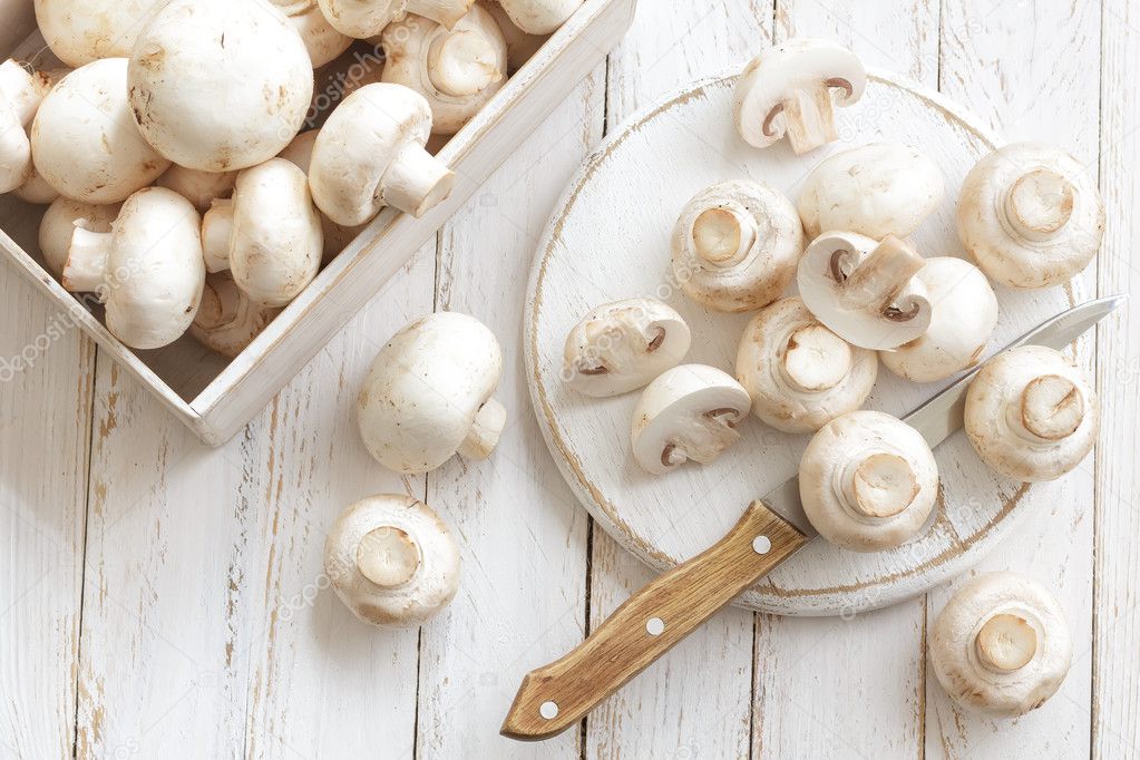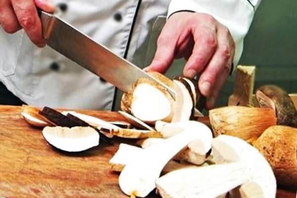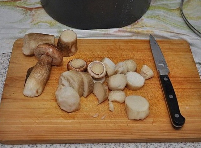 Нарезка. Вымытые грибы более крупных размеров нарезают на куски. Белые грибы, шампиньоны, рыжики и сыроежки употребляют вместе с ножками. Чтобы приготовленное блюдо или консервы выглядели более красиво, ножки грибов готовят отдельно.