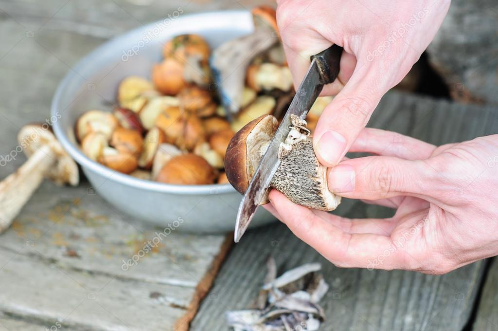 Чистка ножом. Острым ножом из нержавеющей стали вырезают все потемневшие и размягчённые места, а также те части, которые повреждены лесными вредителями. У более старых трубчатых грибов вырезают трубчатую часть шляпки. У некоторых грибов, имеющих вязкую ножку, ее срезают целиком. У сыроежек, маслят поздних и зернистых снимают, начиная с краев, кожицу со шляпки, так как после тепловой обработки она становится слизистой.