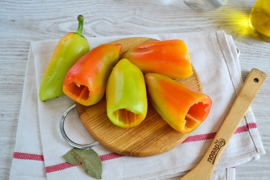Шаг 3Отрезаем у каждой перчины шляпку вместе с плодоножкой, вынимаем светлую часть с семенами и белые прожилки. Должны остаться только полые колпачки.