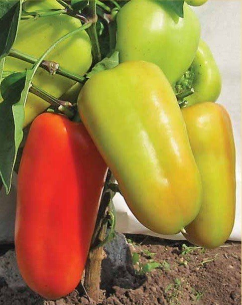 Максимальная толщина стенок — 20 см. Форма плодов напоминает параллелепипед. Она удлинённая, одинакового размера по всей длине. К концу перец немного заостряется.