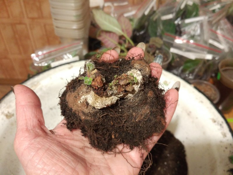 - Пальцами, придерживая стебли и листья, аккуратно вывалить на руку земляной ком.