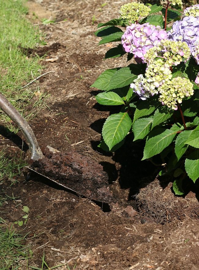 Зачерпните лопатой почву по окружности гортензии, погрузив ее в почву так, чтобы она слегка наклонилась к растению.