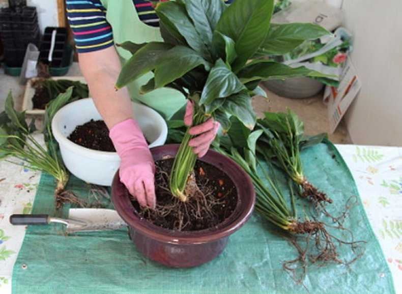 Для начала растения извлекают из горшков. Для этого их обильно поливают. Некоторое время спустя горшок переворачивают, стучат по дну, чтобы растение отделилось. Предварительно можно отделить землю от горшка с помощью ножа.