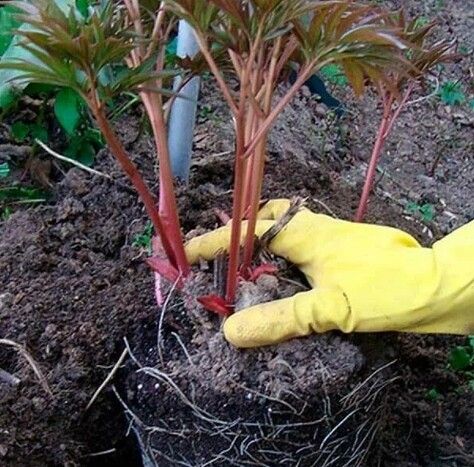 Перед высадкой в новую лунку пион моют в воде и оставляют в тёмном месте на несколько часов, чтобы корневище стало более пластичным.