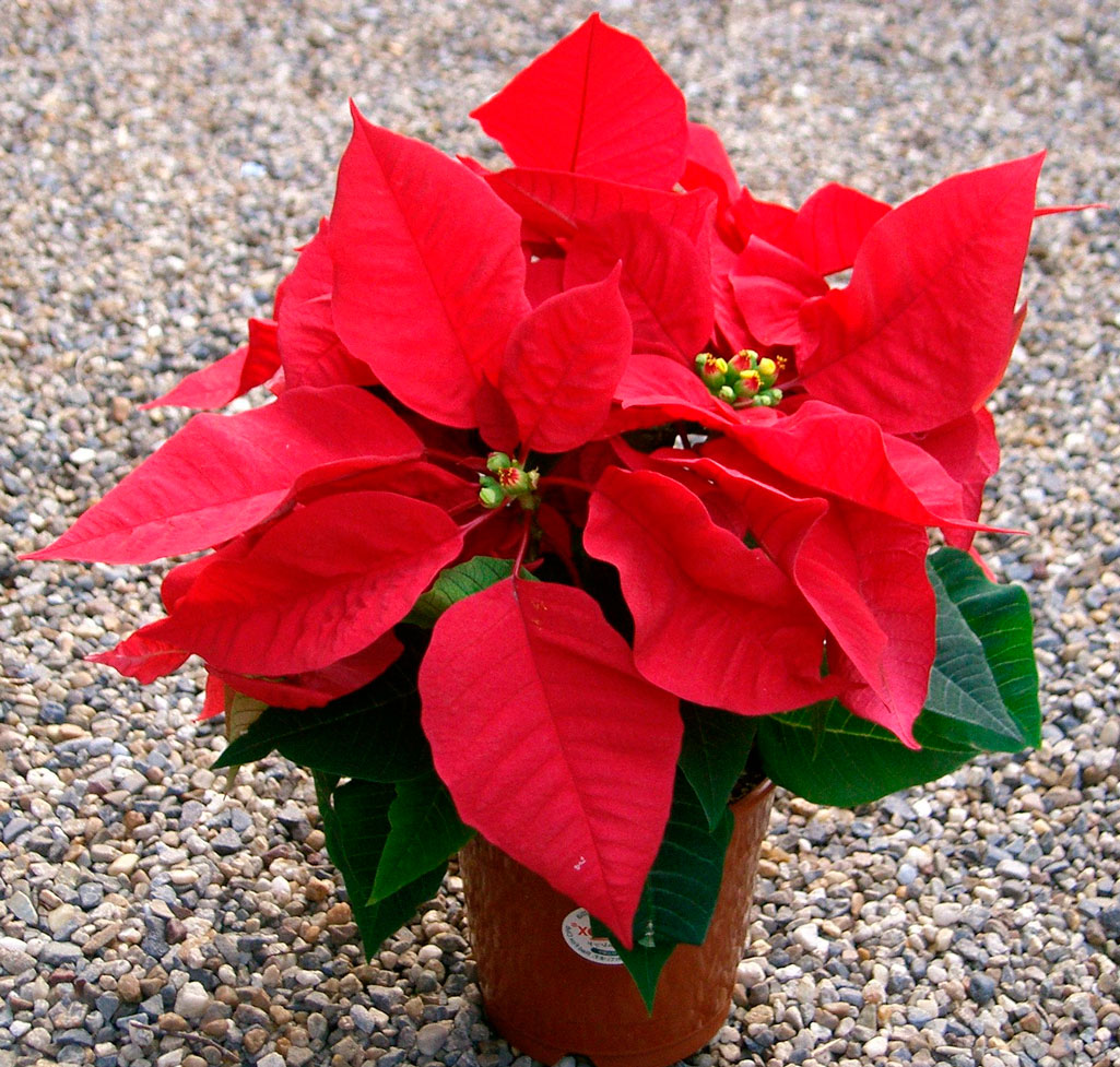 (Хотя мы называем цветные части пуансеттии цветами, на самом деле это видоизмененные листья или прицветники. Настоящие цветы — это маленькие желтые бутоны в центре прицветников.)