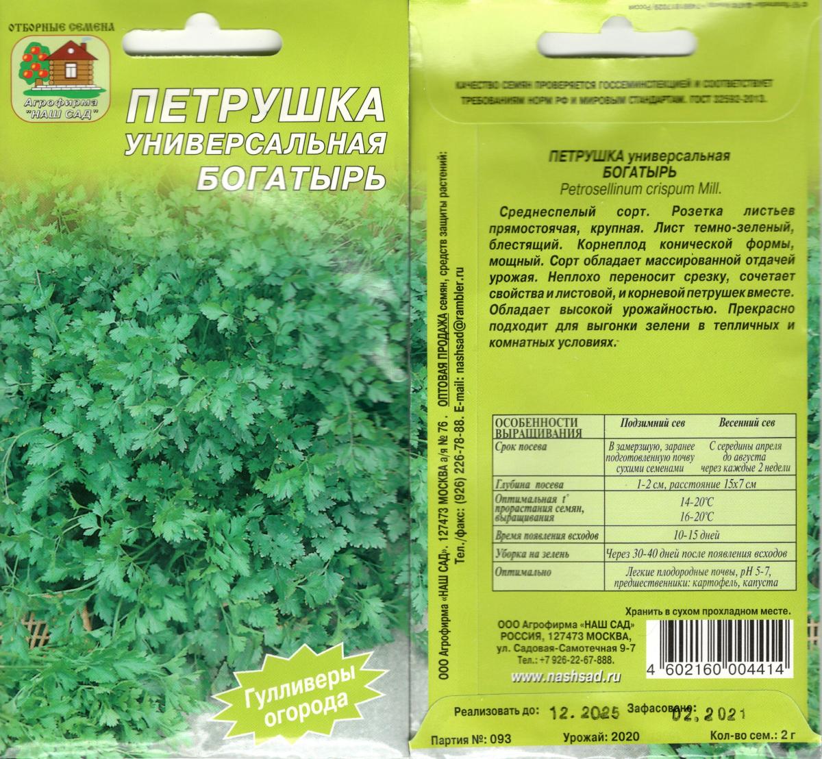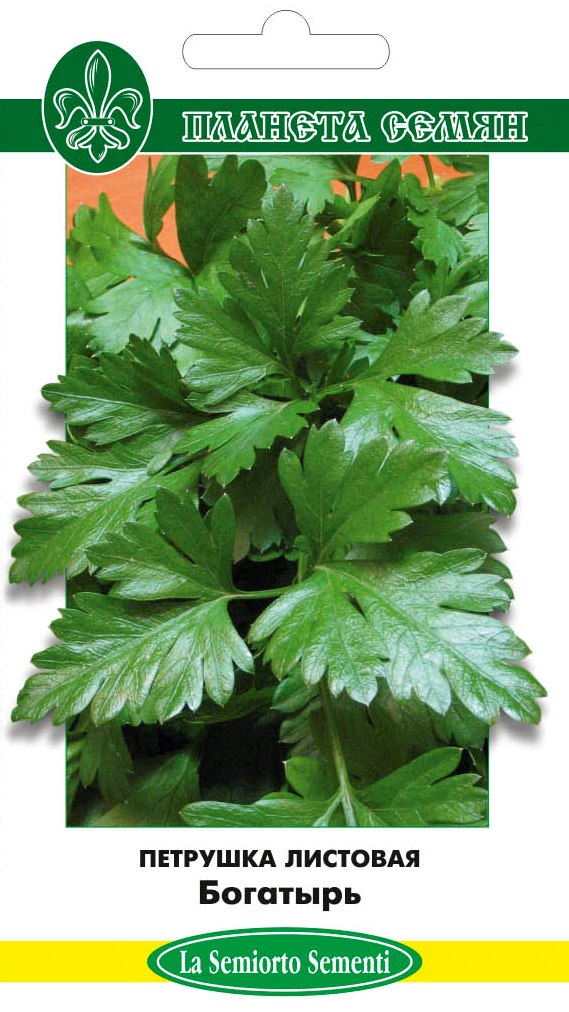 Богатырь (Россия, 2000)16 (2 г)Откройте наш список лучших сортов листовой петрушки, надежного позднеспелого сорта для употребления в свежем виде.Рекомендуется для садовых участков и сельскохозяйственных насаждений. Образует полувысокую розетку из листьев. Растение мощное, сильнорослое. Листья крупные, насыщенно-зеленые, сочные, быстро отрастают после обрезки, долго не грубеют. Из-за позднего созревания кусты второго сезона долго не дают цветоножек, продолжая давать нежную зелень. За один сезон образуется большой корнеплод конусовидной формы длиной до 20 см, который используют в кулинарии. Петрушка «Богатырь» хорошо растет в полутени под кроной плодовых деревьев.Теневыносливость позволяет выращивать сорт в теплице или в домашних условиях на раннюю весеннюю выгонку. Отличается устойчивостью к пятнистости.Для построения полноценной розетки листьев растению требуется редкая посадка с интервалом 5-6 см. Основные преимущества: