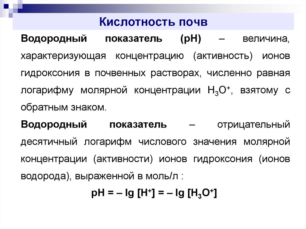 Активность ионов водорода оказывает большое влияние на все химические реакции, протекающие в водных средах. Влажная почва полна химических реакций. pH влияет на доступность многих питательных веществ, симбиотических Rhizobia и биологии почвы.