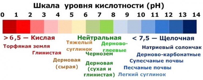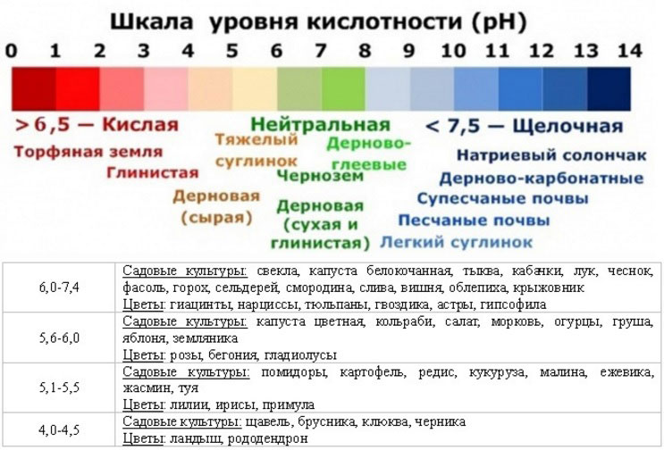 Шкала рН составляет от 0.0 до 14.0. Показатель максимально кислой среды – 0.0, наиболее щелочной – 14.0, нейтральной – 7.0. Например, лимонный сок – 2.4 рН (кислый), вода 7.0 (нейтральная), мыльный раствор – 9.3 (щелочной). Оптимальным показателем кислотности для культурных растений является диапазон рН от 5.5 до 7.5.