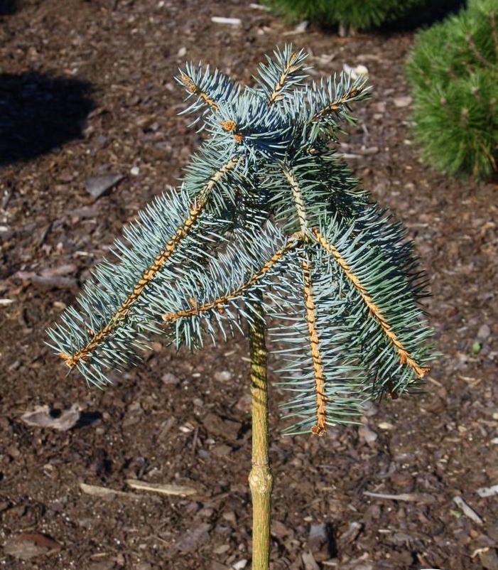 Picea glauca  ‘Pendula’ из коллекции карликовых и редких хвойных деревьев Heartland, дендрарий Бикельхаупт, Клинтон, Айова. Этому растению было 8 лет, когда эта фотография была сделана весной 2003 года.