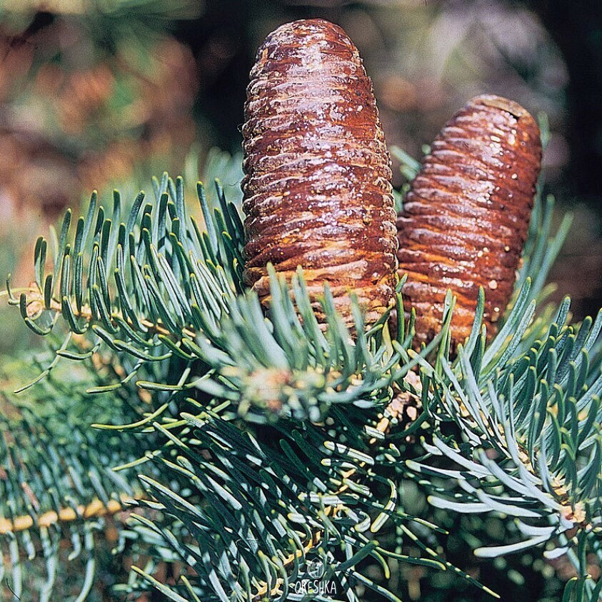 Такая пихта первые плоды дает только после того, как ей исполнится шестьдесят лет. При этом плодоносит она 1 раз в 3 года, в это время на ее ветвях образуются сидячие шишечки зеленого цвета. Их величина постепенно увеличивается. Зрелые шишки имеют цилиндрическую форму и в длину достигают около 12 сантиметров. Благодаря им дерево выглядит особенно эффектно. Вызревшие плоды окрашиваются в коричневый цвет, при этом их поверхность плотно покрыта живицей. Еще находясь на ветвях, плоды распадаются и из них высыпаются семена. Вызревают они в сентябре. Продолговатые коричневые семена имеют крыло бледно-розового окраса.