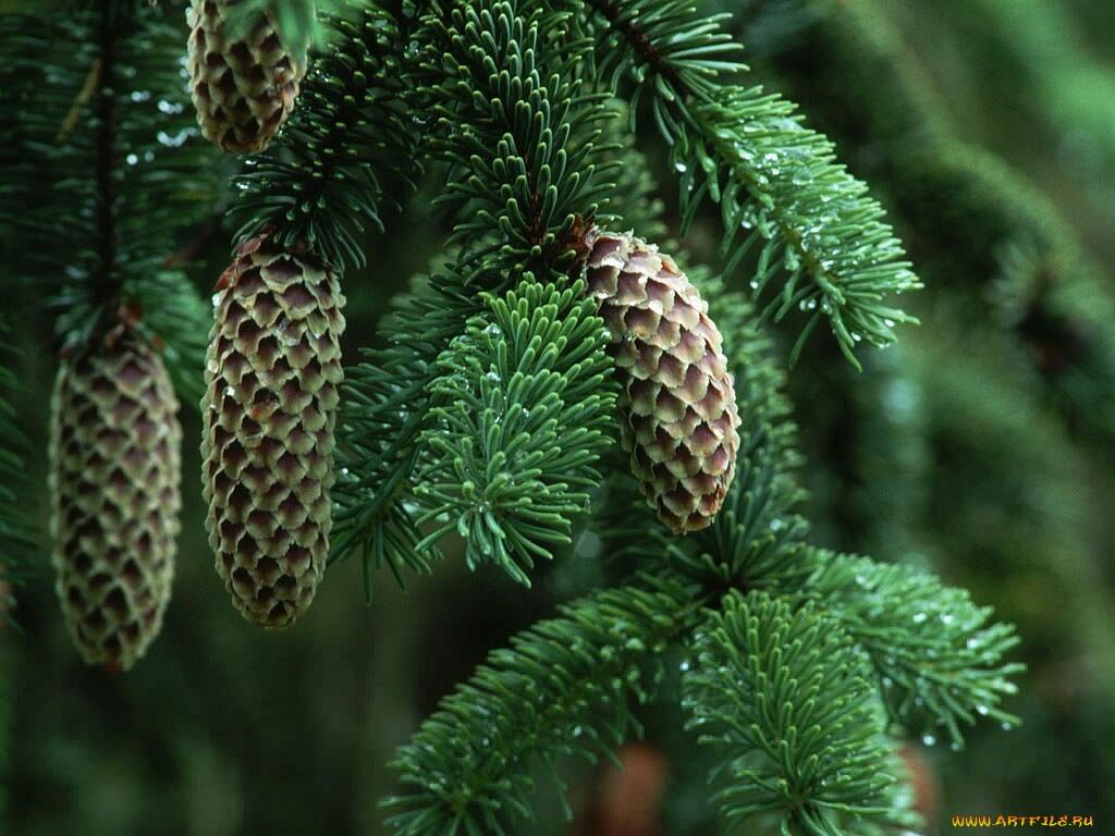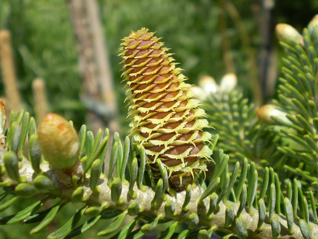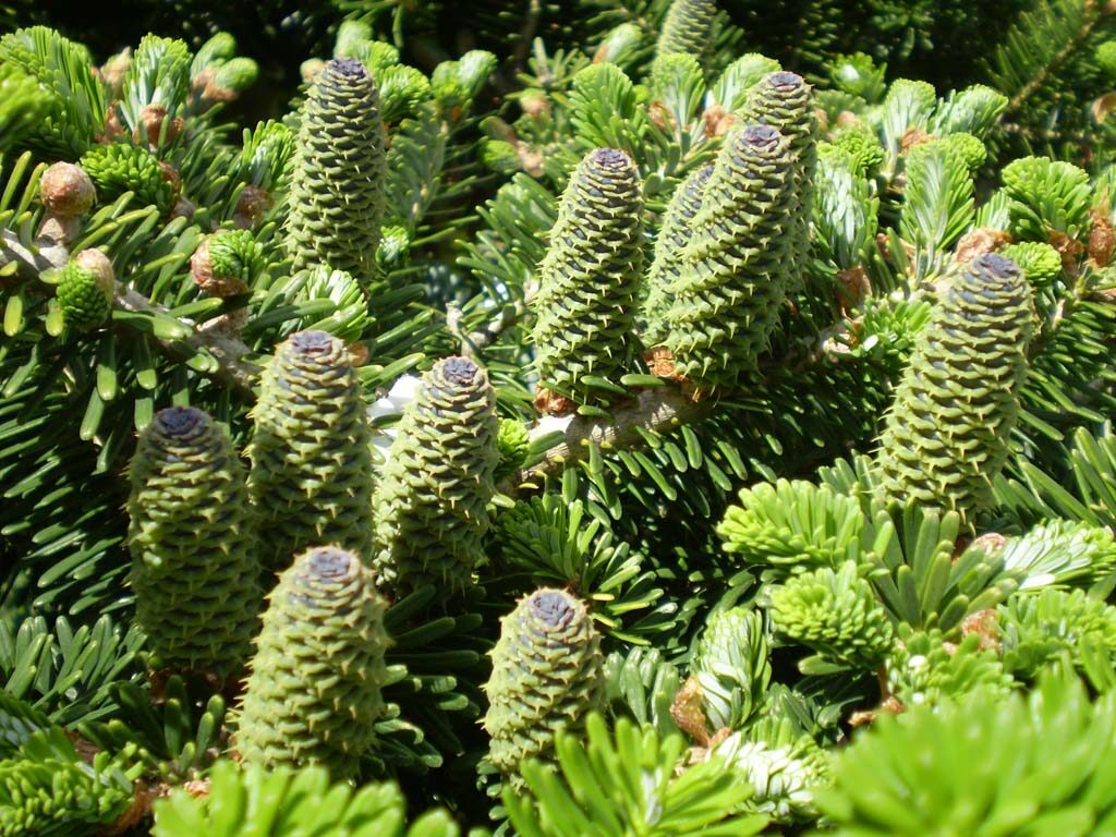 Пихта отличается от ели и шишками, и их расположением. У пихты шишки торчат вертикально вверх, а у ели висят почти вертикально вниз. Пихтовые шишки созревают в первый год и распадаются еще на деревьях для освобождения семян.