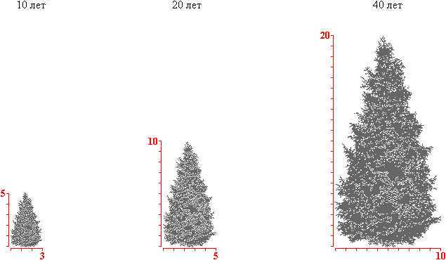 форма кроны: в молодости узкоконическая, с густой мутовчатой кроной, с возрастом широкопирамидальная, более редкая, низко опущенная