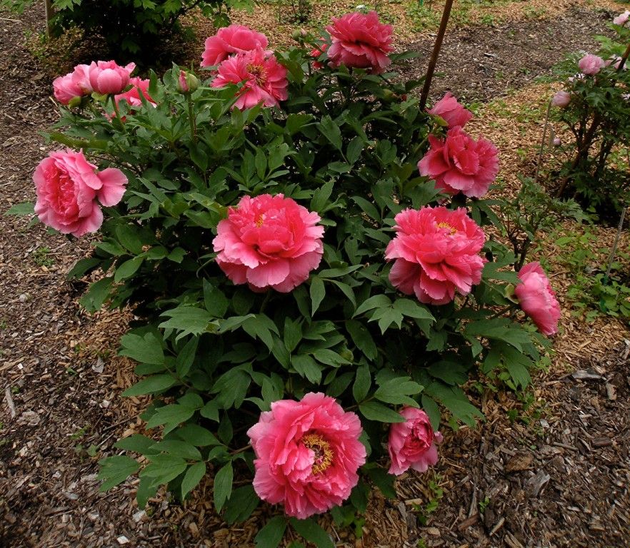 Окраска соцветий варьируется от различных оттенков розового до насыщенного цвета фуксии. - Японская. Цветки на кустах легкие, простые или полумахровые. Особый способ размножения сортов этой группы – прививка черенков к корням травянистых пионов обеспечивает высокую морозоустойчивость растений.