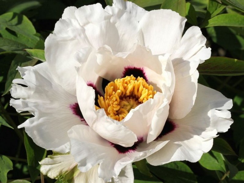 Paeonia suffruticosa имеет большие яркие лепестки и темно-зеленую листву.