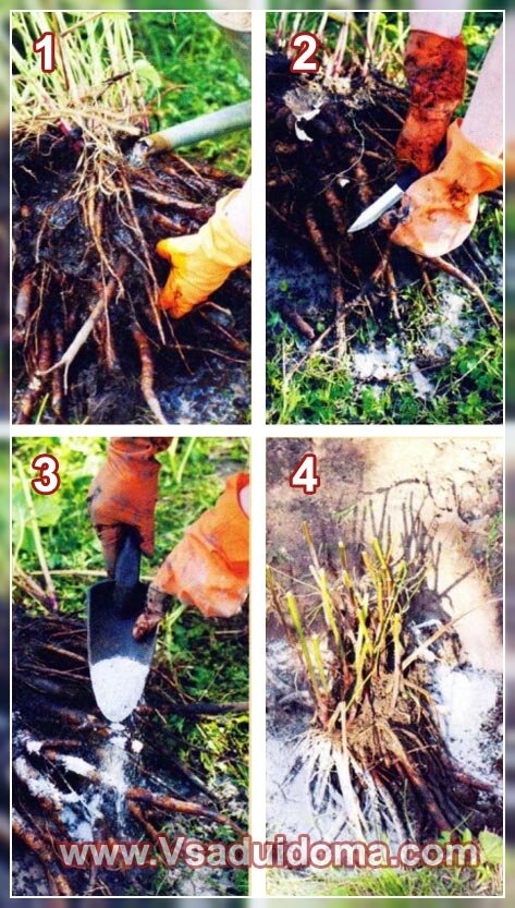 - Перед посадкой осматривают корневище, больные места вырезают острым ножом и припудривают золой за несколько часов до посадки.