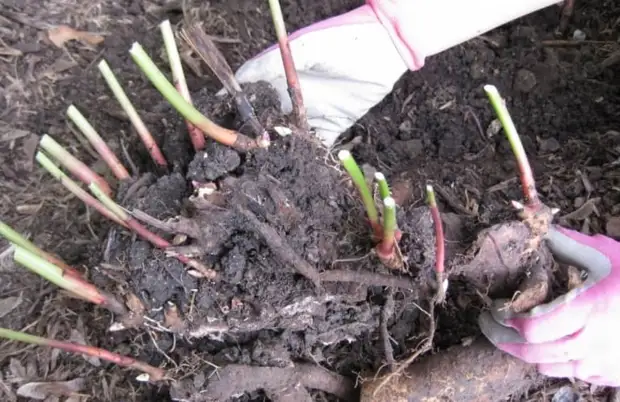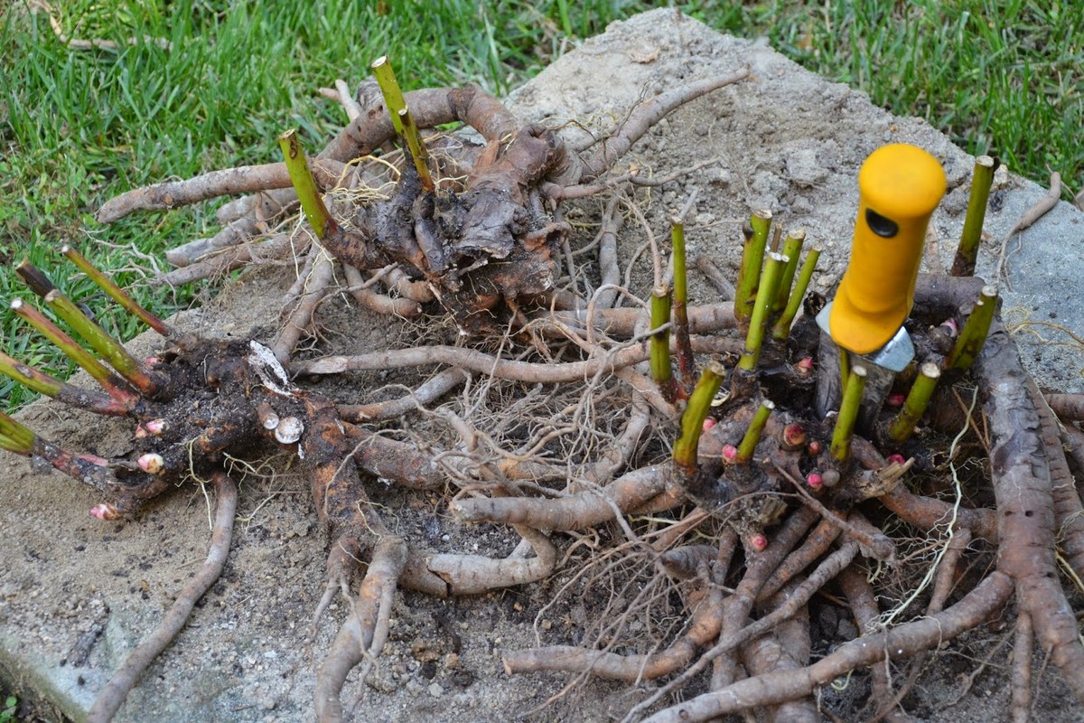 Для начала надо обрезать все побеги, оставив пеньки около 5 см. Затем куст подкапывают по кругу на расстоянии 20 см от побегов. Затем вилами расшатывают его как можно сильнее и выворачивают на поверхность. Именно вилами! Потому что лопатой можно повредить нежные почки и ломкие корни. Иногда приходится использовать лом.
