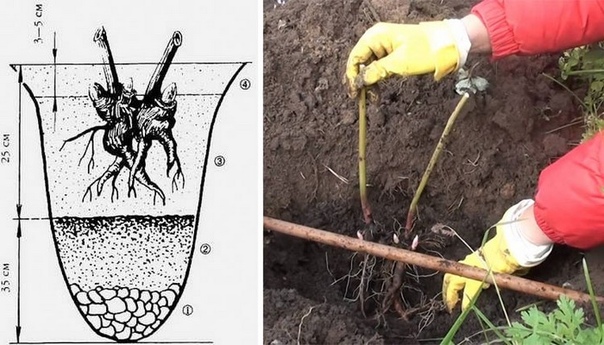 Ямы копают глубиной 70 см и такого же диаметра на расстоянии 1 м друг от друга. На дно надо положить дренаж — битый кирпич, мелкие камни, нарезанные ветки. Это важно, потому что пионы не любят застоя воды, а без дренажа корни могут загнить.