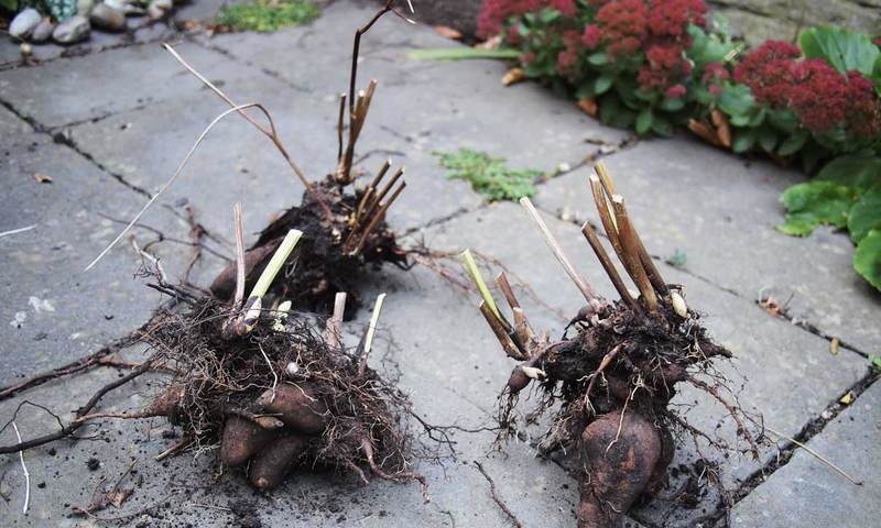 - Осторожно выкопайте растения, стараясь не обрезать и не повредить корни.
