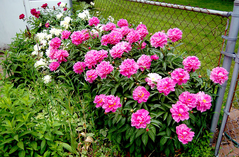 Пионы часто выращивают вместе так же, как чайно-гибридные розы группируют на традиционных клумбах. Пионы, безусловно, выглядят красиво, собранные вместе, и после того, как они заканчивают цветение, листва продолжают довольно хорошо держаться до конца вегетационного периода. У такой схемы посадки есть только один недостаток: пионы цветут в течение столь короткого промежутка времени, а затем остается довольно невзрачный простор зелени до конца лета.