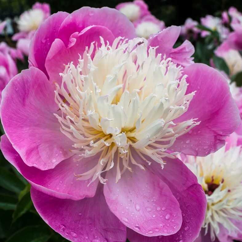 Этот пион японского типа потрясающе цветет на 36-дюймовых стеблях в середине сезона. Текстура в центре цветка привлекает внимание тех, кто хочет создать полностью белый сад.