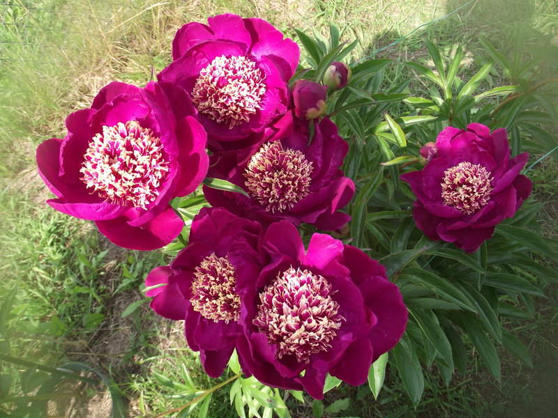 Казачок. Темно-вишневые цветки с кудрявыми желтыми тычинками в центре. Куст компактный, очень декоративный. Высота 70 см. Листва темно-зеленая. Великолепен для ландшафтного оформления. Срок цветения ранний.