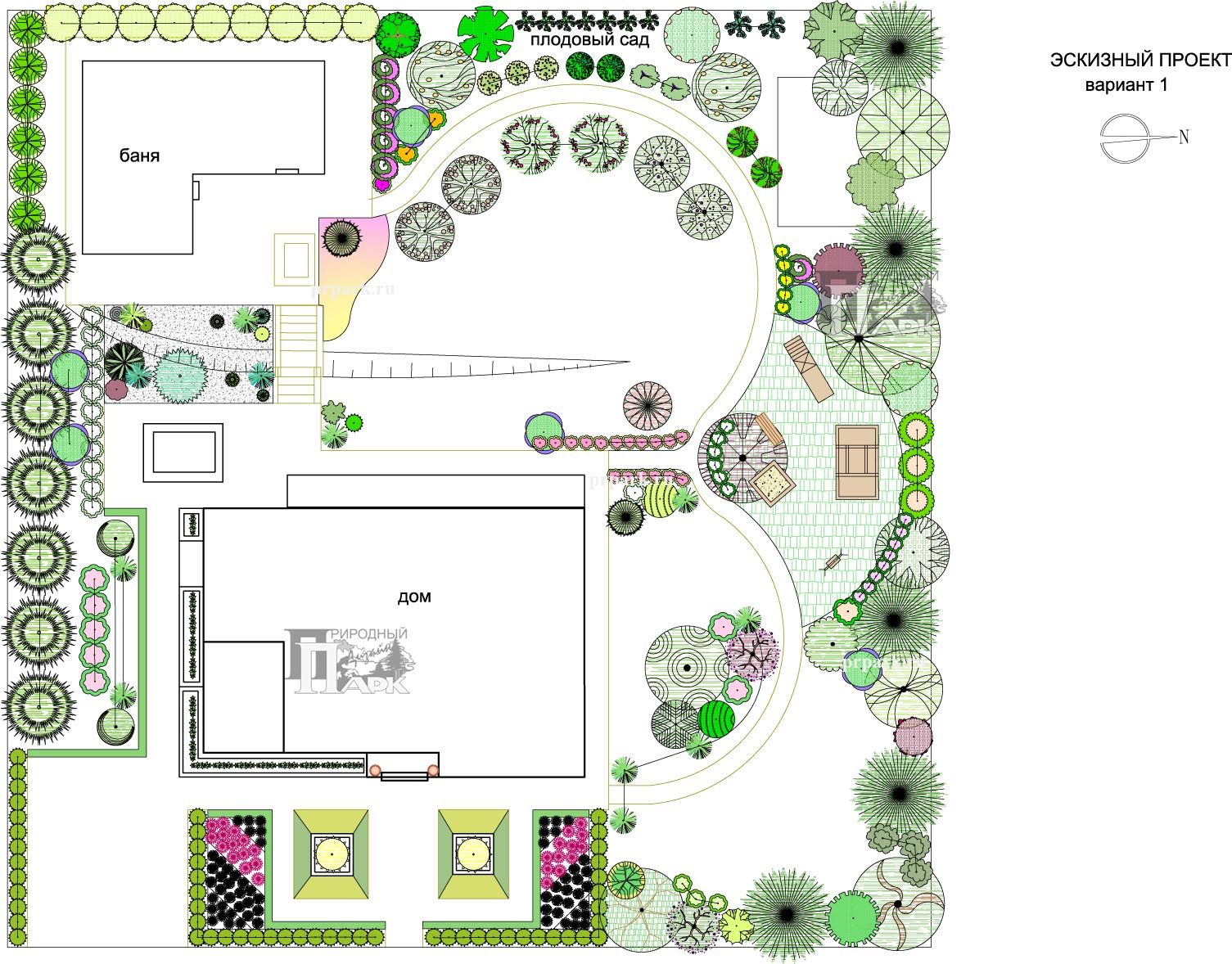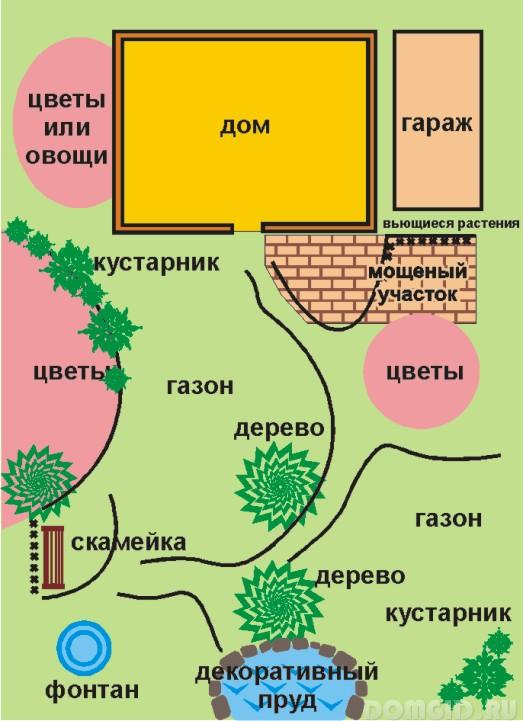 Его конфигурация задает способ распределения зон различного назначения и траекторию садовых дорожек.