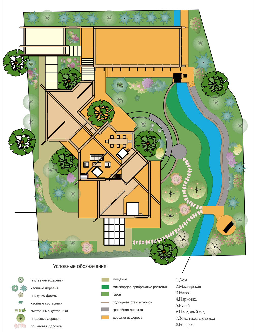 Зона бассейна отделена декоративной стеной. В эту зону есть вход с четырех сторон. Перед домом имеется декоративная зона в японском стиле, включающая сухой ручей, а также многолетние вечнозеленые растения, символизирующие вечность. Огород спроектирован в форме полукруга, а грядки трапециевидной формы подобны расходящимся лучам солнца. Важно отметить, что дорожки требуют засыпки декоративной галькой, иначе такой сад не будет выглядеть аккуратным.