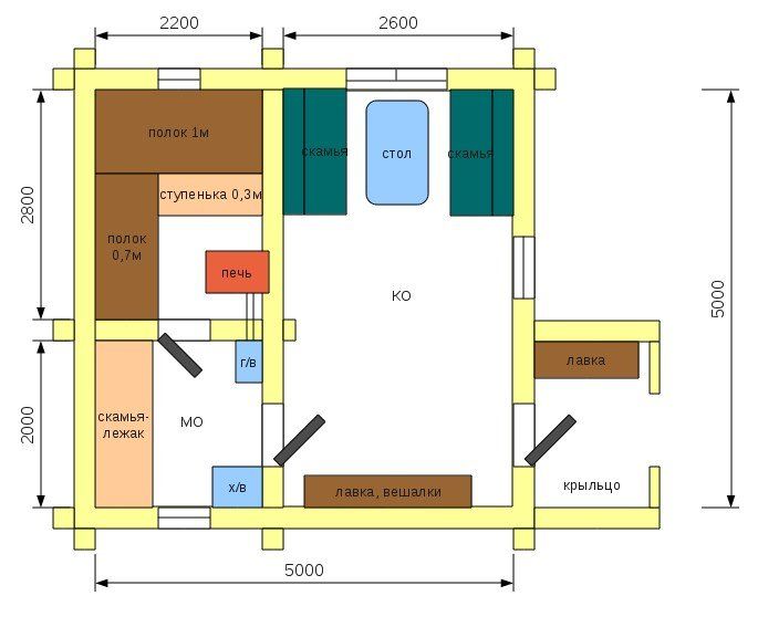 При входе в основное помещение необходим буфер для удержания тепла. Обычно это предбанник, в котором можно оставить верхнюю одежду, обувь, инвентарь, дрова.