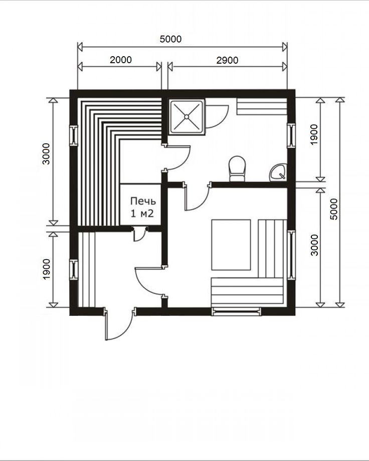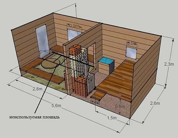 Окна здесь не нужны вовсе; - дверь лучше всего сделать узкой и невысокой, чтобы выходило как можно меньше пара;