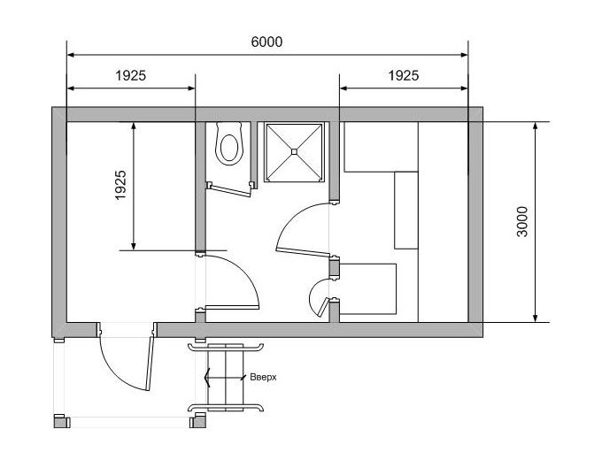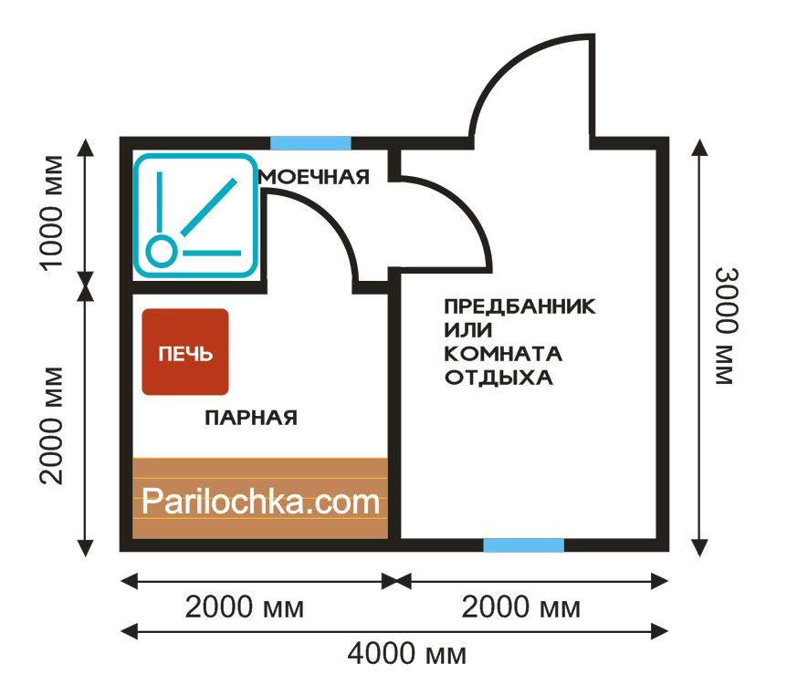 Строение в виде ровного прямоугольника позволит сконструировать парную так, чтобы хранить в ней тепло дольше. Это помещение стоит разместить по противоположной стене от входа, отгородив небольшой моечной. Останется место и для тамбура, и для зоны отдыха.