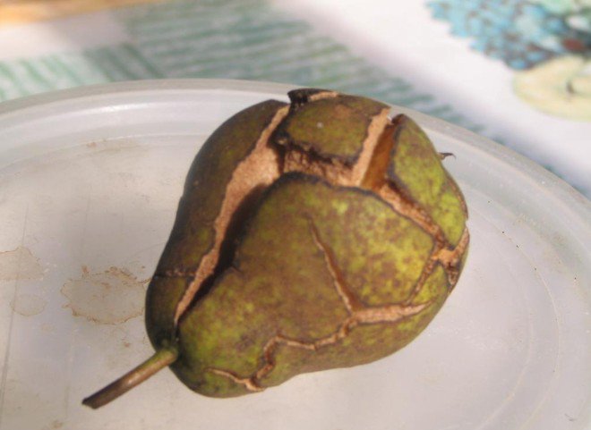 - Важно вовремя снимать экземпляры, достигшие технической зрелости, так как перезрелые плоды лопаются, тем самым давая шанс спорам грибка проникнуть внутрь. И в результате через короткое время груши внутри гниют, а затем вянут.