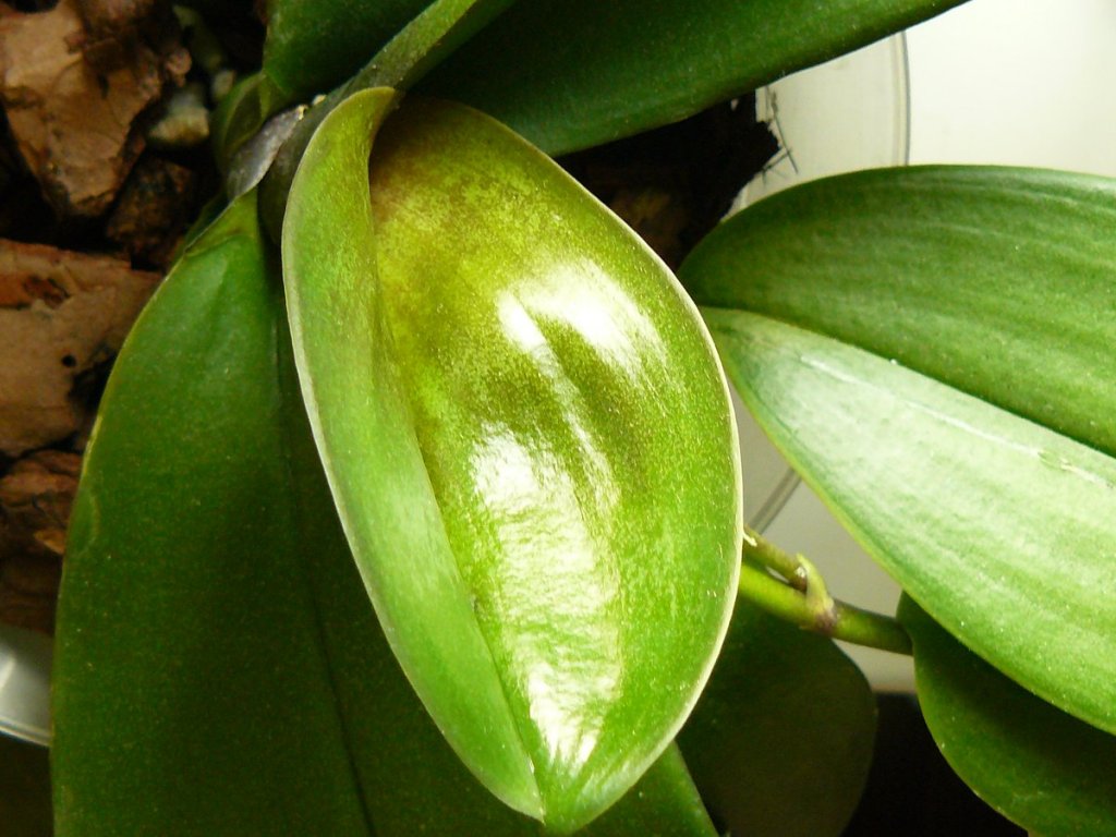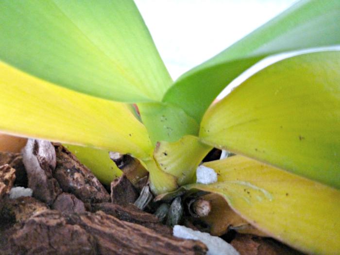 Если листья орхидеи становятся бледнее чем были, желто-зеленой окраски, но при этом листья плотные, не обезвоженные — нет морщин, корни в хорошем состоянии (нет гнилых или сухих корней), но растение замедлило свой рост, то это говорит о недостатке питания.