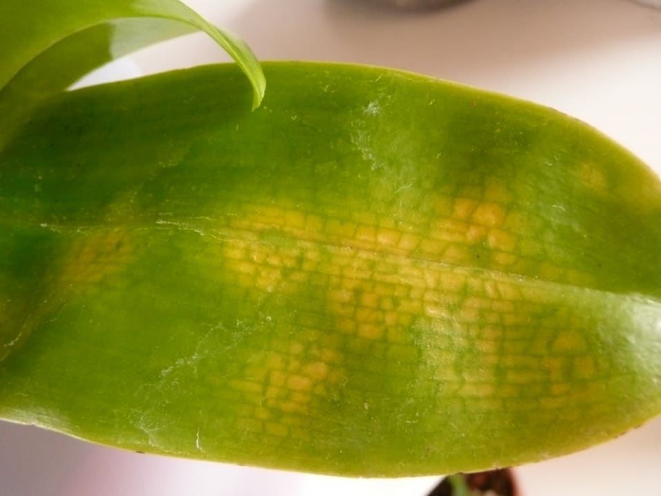 Если при поливе орхидей используется жесткая вода, то субстрат засоляется. Избыток солей кальция не дает усваивается железу, начинается хлороз — листья приобретают желто-зеленую окраску. В этом случае пересаживаем орхидею в свежий субстрат и делаем внекорневую подкормку — по листьям.