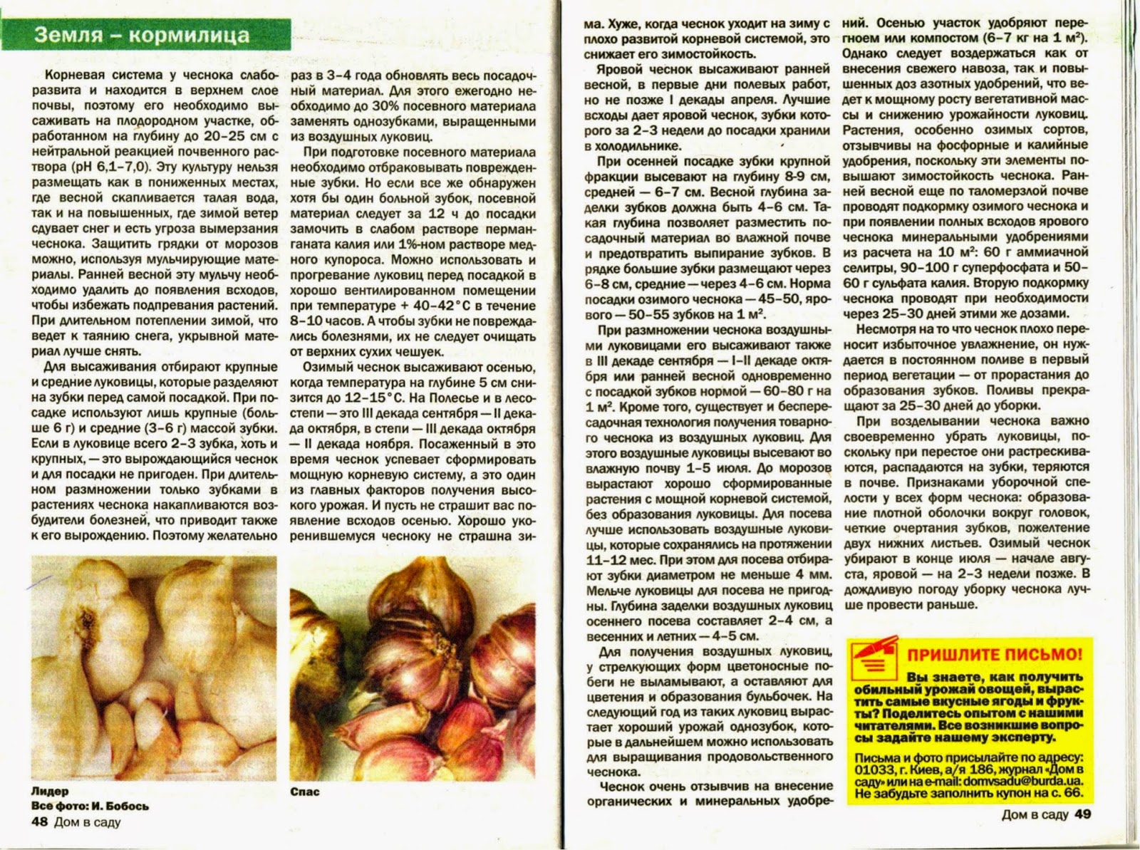 – для получения высокого урожая чеснока нужно как минимум дважды произвести его подкормку коровяком (1 кг на 8 л воды) или куриным помётом (1 кг на 10 л воды) на 5 квадратных метров.