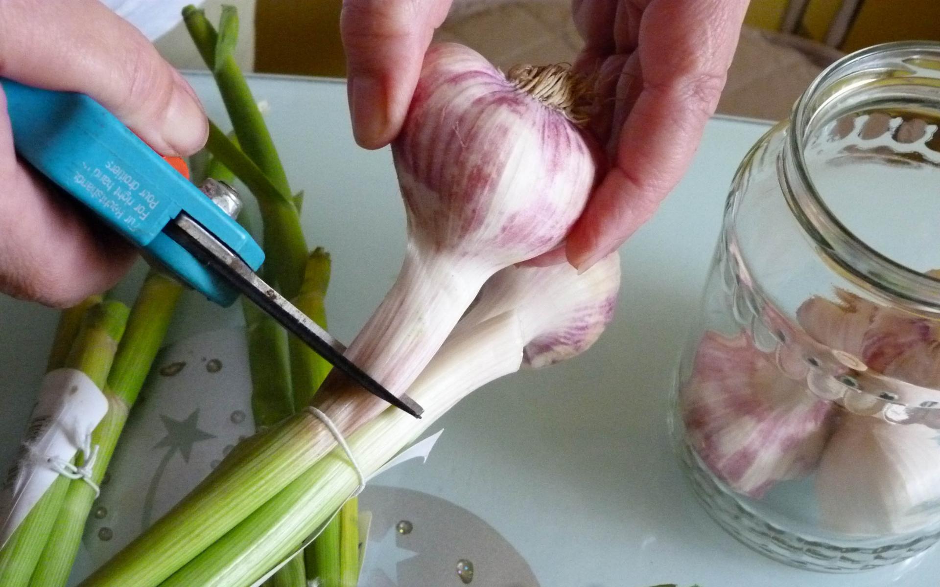 Обычно черенки чеснока срезают таким образом, чтобы растение направило всю свою энергию на формирование большой луковицы.