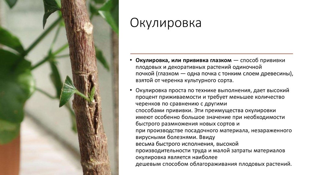 Окулировка плодовых деревьев проводится и весной: привитая почка пробуждается и дает побег в тот же сезон. Из-за этого весеннюю окулировку называют окулировкой прорастающим глазком.