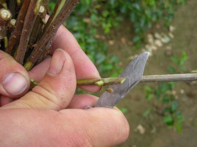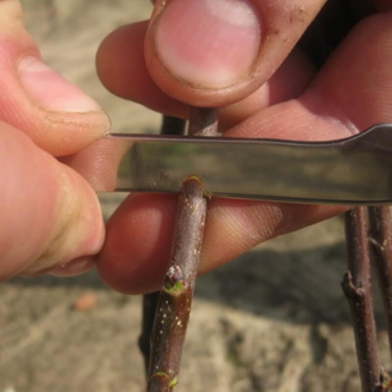 - Для этого берут черенок в левую руку основанием вниз, а правой качающим движением ножа делают полулунный надрез коры ниже почки на 1,5 см.