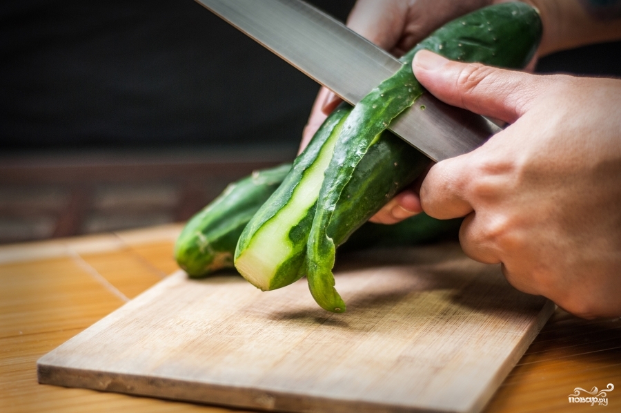 Отрежьте по кусочку с каждого конца. Возьмите отрезанный кусок и круговыми движениями потрите им конец огурца.Когда вы потрете, вы заметите, что образуется пена. Утверждают, что эта пена убирает горечь огурца. Отбросьте кончики, помойте огурец и все готово.