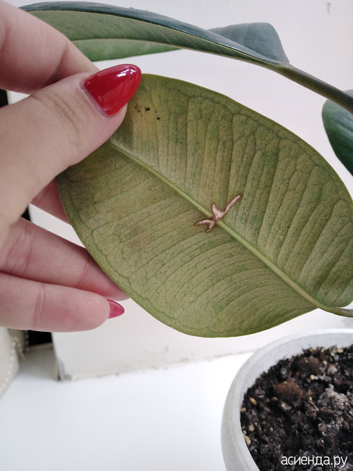 В редких случаях причиной потери листьев каучуконоса может быть заражение вредителями. Типичными виновниками являются щитовки, и вы увидите их на листьях и стеблях.