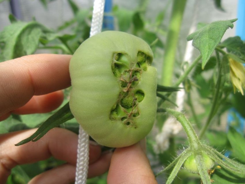 - Значительное колебание температуры в дневное и ночное время также способствует появлению трещин на томатах.