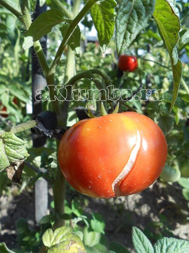 Главная причина растрескивания томатов — это, безусловно, нарушение режима полива, а именно его неравномерность (то очень сухо, то влажно; то сухо, то очень влажно).